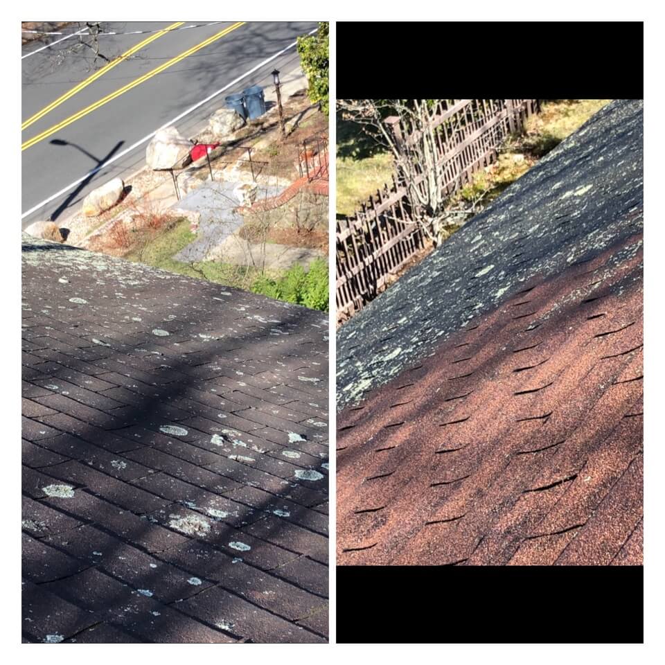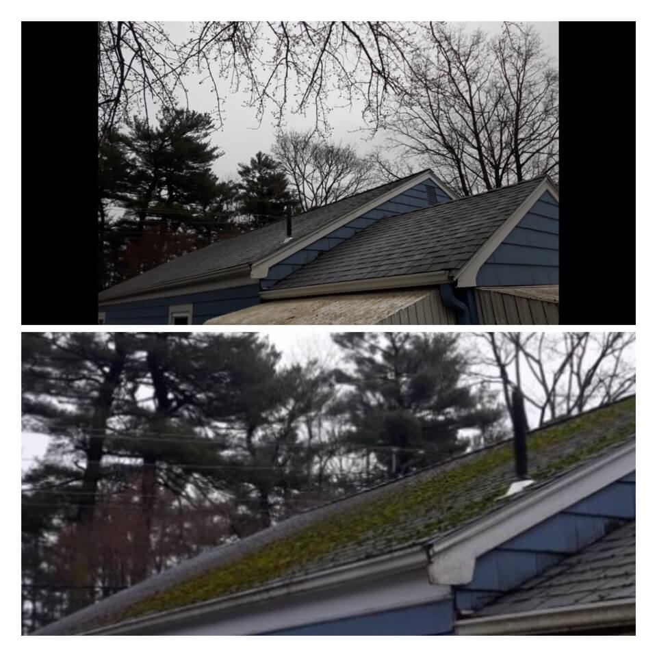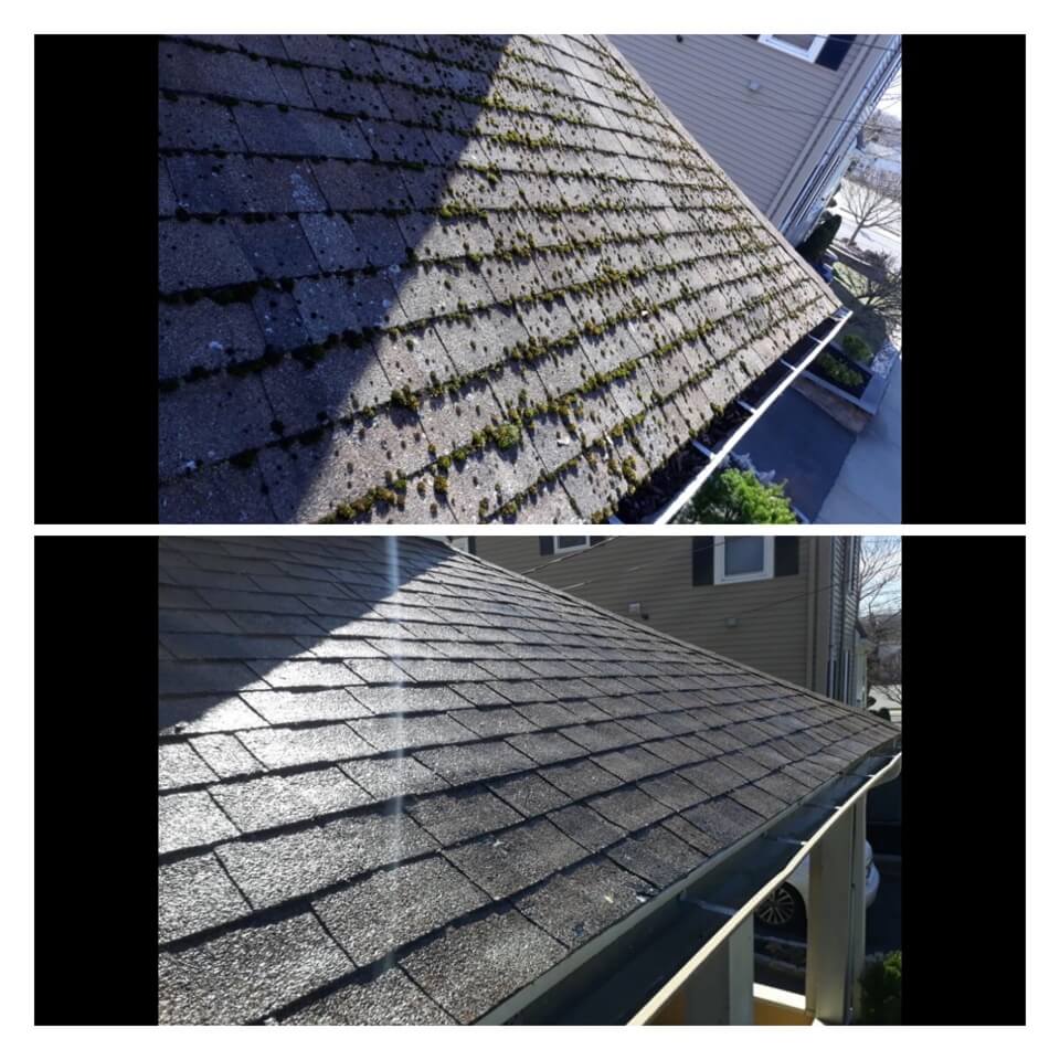 HiCleaners is the most experienced company in Hingham, MA that deals with roof washing and roof soft washing. All of our employees are trained to recognize precise solution mixing ratios to provide you with the safest and most effective soft washing service. Roofs are a commonly neglected part of a house due to the fact that most people don’t have ladders to access it, so it is very easy to just leave it alone and forget about problems that may start to arise. Just like many home owners, discoloration and small bits of moss on a roof can be overlooked because of the misconception that it is just aesthetic. However, it isn’t just aesthetic, the moss slowly lifts the granules off the shingles which in turn shorten the life of the shingle. The moss also spreads, just like any bacteria if it is left alone for too long, it can quickly become a problem that spirals out of control. Call HiCleaners for a free quote, we only use the most advanced eco-friendly solutions and equipment to make sure the job is done right, for the safety of the employees, your plants, grass, pets, and children.